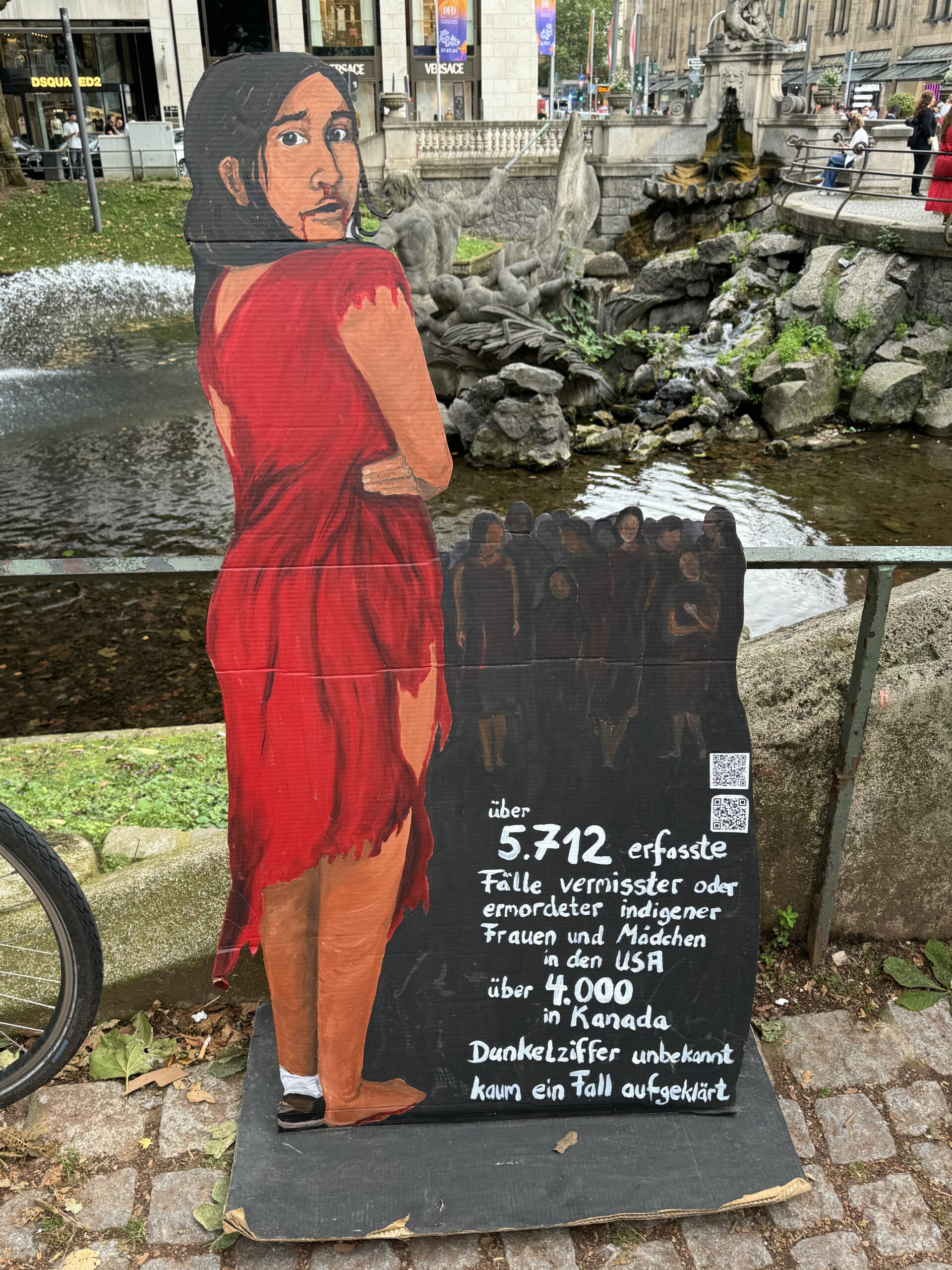 Falls ihr am Dienstag, den 23. Juli 2024 am Tritonenbrunnen in Düsseldorf rote Kleider in den Bäumen hängen gesehen habt – sie sind Zeichen der Solidarität und als Symbol der Erinnerung an die Tausenden ermordeten und verschwundenen indigenen und Frauen und Mädchen in den USA und Kanada. De ReDress-Installation wurde ursprünglich von der kanadischen Künstlerin Jaime Black entworfen. Sie soll eine visuelle Erinnerung an die erschütternde Zahl von Frauen in Kanada und den USA sein, die ermordet wurden oder verschwunden sind.